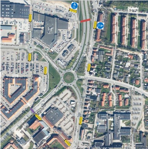 Cyklister og fodgængere kan i stedet benytte tunnelen ved Hotel Scandic på Nørretorv 56 eller fodgængerfeltet ved Holbækvej.