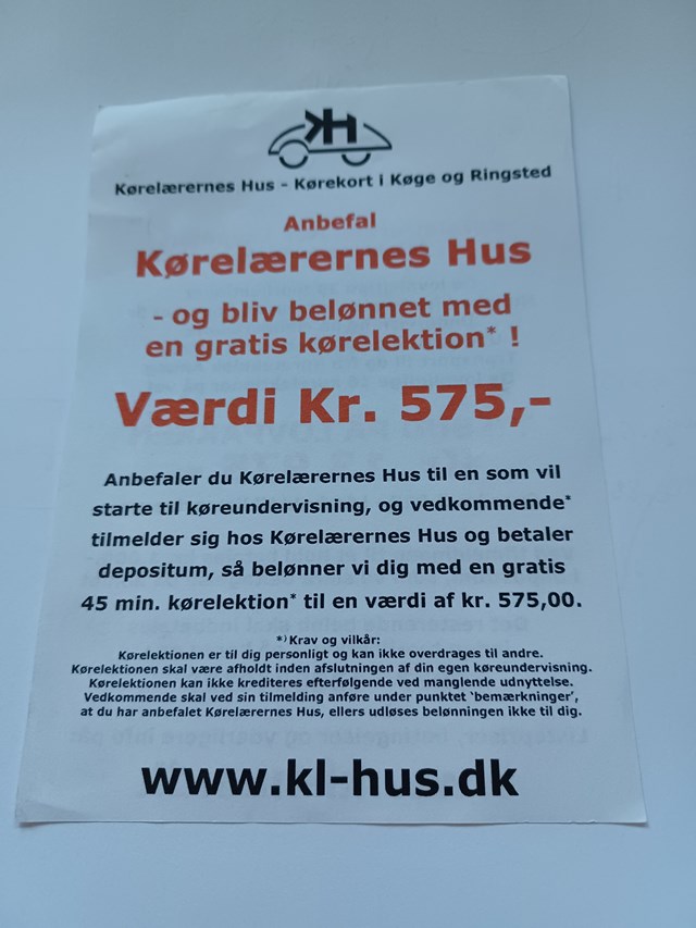 Anbefaler du Kørelærernes Hus til en, som vil starte til køreunderivsning og vedkommende* tilmelder sig hos Kørelærernes Hus og betaler depositum, så belønner vi dig med en gratis 45 minutters kørelektion* til en værdi af kr. 575,00.