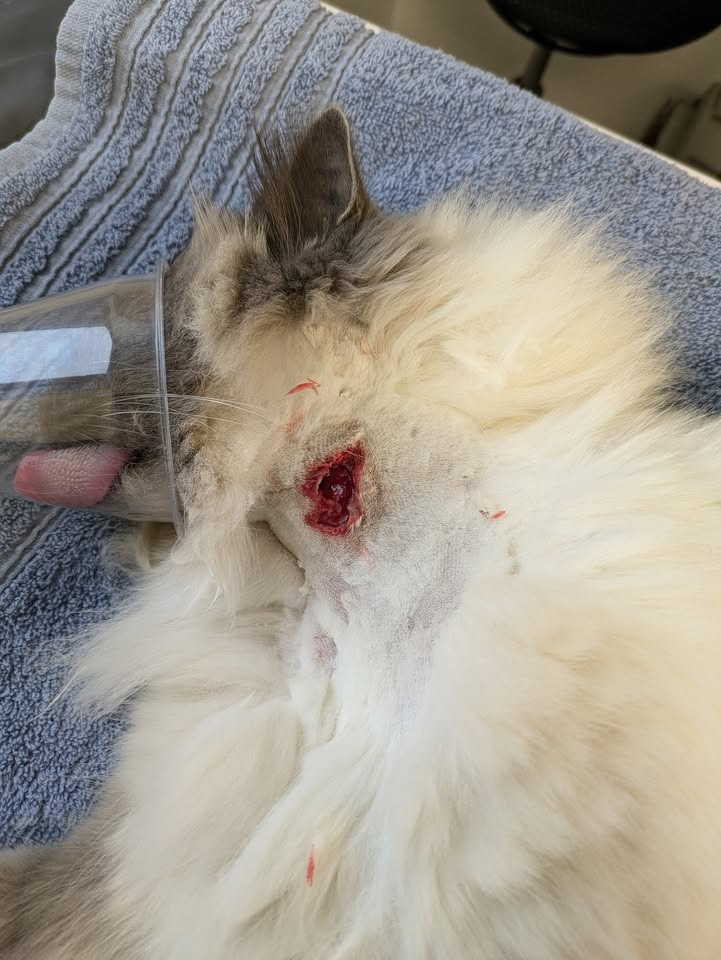 Denne gang gik det rigtig galt og Cash havde fået et voldsomt sår på halsen, han var meget heldig at det ikke var dybere. Vi kunne nemlig se pulsåren lige under det dybeste sted i såret